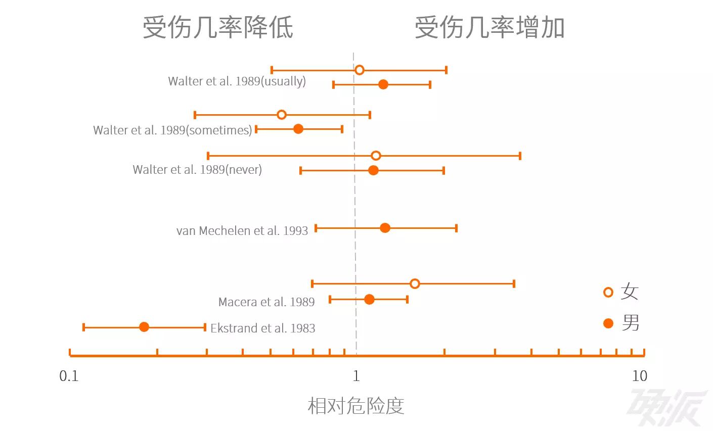 上面这张图是一些关于训练前拉伸对受伤几率影响的研究总览①。竖线右侧的实验是发现拉伸会使受伤几率相对增加的;竖线左侧,则是发现拉伸可以相对降低受伤几率的。
