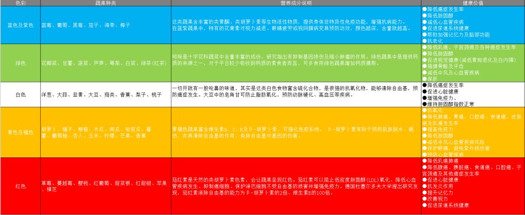 「彩虹摄食」原则部分,则指蔬果的色彩如彩虹般大致可分为「红、橙、黄、绿、蓝、紫、白」七色,不同颜色所含的维生素、矿物质、纤维及植化素不尽相同,应均衡摄取各色蔬果。